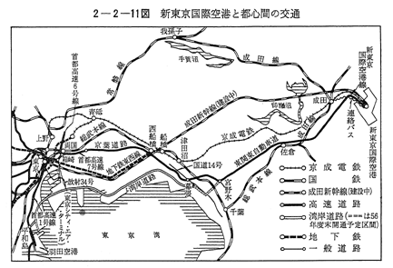 新空港が,都心から約60キロメートルの地点に位置することから,航空旅客,送迎客等の空港利用客の都心〜新空港間の輸送を円滑に行うための対策(いわゆるアクセス対策)が空港機能を維持していくために極めて重要な要素となっている。このような認識の下に,次の対策を講じている 〔2−2−11図〕。