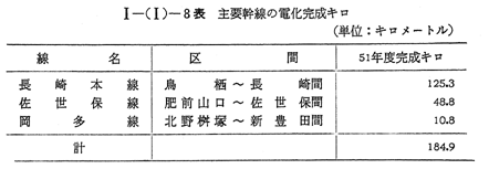電化工事については,51年度に新線を含めて 〔I−(I)−8表〕のとおり完成した。 この結果,51年度末の電化キロは7,813.0キロメートル(前年度末7,628.1キロメートル)となり,電化率は36.7%(同35.9%)となった。