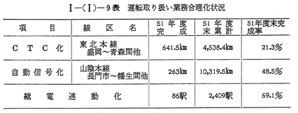 また,電化に関連して検修設備の整備を図った。 一方,運転取り扱い業務の合理化のため,CTC化,自動信号化及び継電連動化の工事を 〔I−(I)−9表〕のとおり実施した。