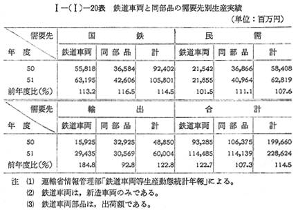 1 鉄道車両工業鉄道車両製造業者は昭和51年度末現在で15社,関係従業員は約13,000人である。このうち鉄道車両(新造)の年間生産額50億円以上の企業は8社で,総生産額の約90%を占めている。 鉄道車両の生産は,鉄道事業者からの注文生産であるため,生産の波動が大きく平準化ができにくく,また,多種少量生産の労働集約型産業であり,人件費,原材料価格の高騰等の影響を直接受け,経営の近代化を図ることの困難な事業である。 51年度の鉄道車両の生産実績は 〔I−(I)−20表〕のとおり,1,145億円で前年度に比べ22.7%の増加であった。需要先別にみると,国鉄向けは,632億円で前年度に比べ13.2%の増加にとどまった。民需では,219億円で前年度に比べ1.5%の増であった。輸出は,294億円で前年度に比べ84.8%と大幅に伸びた。これは,50年度において大口輸出の成約があったエジプト向け電車110両,キューバ向け貨車300両及びニュージーランド向け車掌車73両の生産等によるものである。