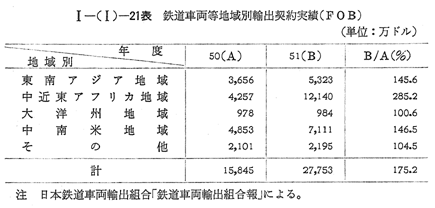次に,51年度の鉄道車両等の輸出契約実績は 〔I−(I)−21表〕のとおり,2億7,753万ドルで前年度に比べ75.2%の大幅増であった。輸出の主たるものとしては,ブラジル向け電車,ナイジェリア向け貨車・客車,エジプト向け電車,モロッコ向け電気機関車等であり,中近東アフリカ地域が全体の約44%を占め,大きく伸びている。