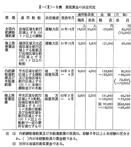 船員の最低賃金は,最低賃金法の定めるところにより44年に内航鋼船運航業を決定したのをはじめとして,45年に木船運航業を49年に海上旅客運送業について決定した。 これら船員の最低賃金の決定状況は 〔II−(II)−8表〕のとおりである。