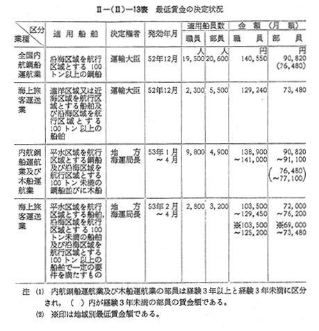 船員の最低賃金は,「最低賃金法」の定めるところにより44年に内航鋼船運航業を決定したのをはじめとして,45年に木船運航業を49年海上旅客運送業について決定した。 これら船員の最低賃金の決定状況は 〔II−(II)−13表〕のとおりである。 なお,漁業については未適用であるが,現在船員中央労働委員会において,適用の可否について審議が行われているところである。