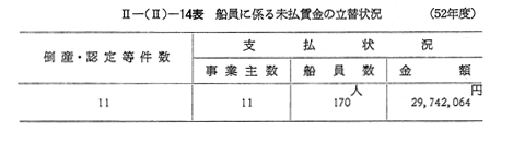 「賃金の支払の確保等に関する法律」に基づき,企業倒産等に伴い賃金の支払を受けることが困難となった労働者に対して政府が未払賃金の立替払を実施しているが,52年度の船員に対する未払賃金の立替払状況は 〔II−(II)−14表〕のとおりであり,前年度の立替払金額に比し12.5%の増加となった。