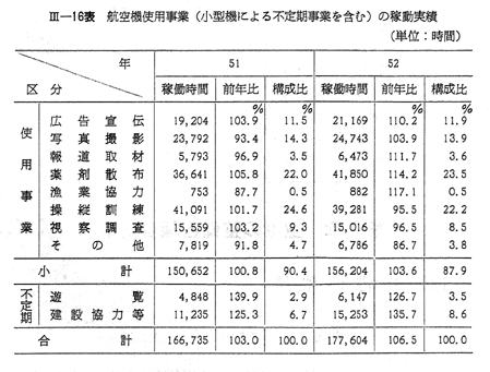 航空機使用事業は,航空機を使用して広告宣伝,写真撮影,報道取材,薬剤散布,操縦訓練等旅客又は貨物の運送以外の行為を請け負う事業である。53年7月1日現在で航空機使用事業の免許を有しているものは52社あり,このうち定期航空運送事業及び不定期航空運送事業の免許を有しているものが3社,不定期航空運送事業の免許を有しているもの34社,その他の15社が航空機使用事業のみの免許を有している。 この事業に使用されている航空機の総数は53年7月1日現在で544機(定期航空運送事業に使用されるものを除く。)で,このうち飛行機254機,ヘリコプター290機となっている。52年における年間稼動実績は 〔III−16表〕のとおりである。