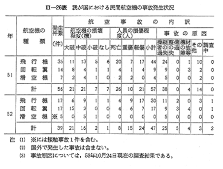 事故原因のうち,飛行機にあっては,着陸の際脚出し操作を失念したことによる胴体着陸事故が3件,回転翼にあっては,航行中又は着陸時に送電線索道等との接触による墜落又は不時着事故が4件と,これらの原因による事故の発生が自立っている。