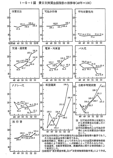 1 運輸事業をとりまく経済動向昭和53年度の国民総生産額は約210兆円(名目,速報値)であり,対前年度実質増加率は5.5%であった。運輸・通信事業がGNPに占める割合は概ね6〜7%で推移している。 新経済社会7カ年計画では,60年度の国民総生産を310兆円程度(53年度価格),それまでの年平均伸び率を5.7%と予測しており,また,産業構造については,運輸・通信業の構成比はほぼ現状のまま推移し,その伸び率も5.6%と予測している。今後のエネルギー情勢次第ではこれらの予測値も変更が予想され,運輸部門においても厳しい状況が予想されるところである。 国民消費支出はやや上昇傾向にあり,53年度は約120兆円(名自,速報値)であった。 〔1−5−1図〕は,総理府家計調査により,費目別実質金額指数の推移をみたものであるが,交通・通信費は全体として増加している。