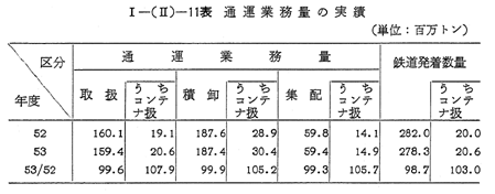 53年度における通運事業の業務量は 〔I−(II)−11表〕のとおりであり,取扱,積卸,集配ともほぼ横ばいである。このうちコンテナ扱いについてはいずれも増加している。これは下半期に国内景気全般の回復により荷動きが活発化したこと,国鉄が53年10月のダイヤ改正後増送運動を展開したこと,過積載規制強化による鉄道輸送への転移がみられたこと等が原因となっているものと考えられる。