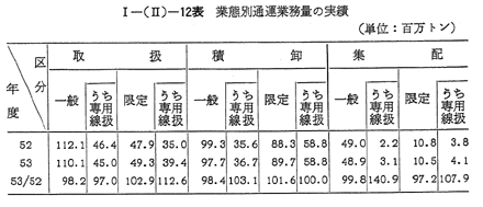 業態別にみた業務量は, 〔I−(II)−12表〕のとおりである。一般免許業者の業務量は,52年度に比べ取扱,積卸,集配の数量がそれぞれ,98.2%,98.4%,99.8%とほぼ横ばいである。これに比べて限定事業者の業務量は,集配を除いて増加している。これは上述した理由と同様のためと考えらる。