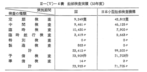 船舶検査は国及び日本小型船舶検査機構により実施されているが,その種類及び昭和53年度の検査実績は 〔II−(V)−4表〕のとおりである。
