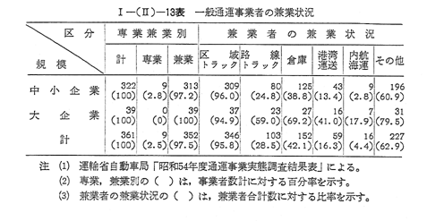一般通運事業者の兼業状況をみると, 〔I−(II)−13表〕のとおりである。これによると,一般通運事業者361社のうち97.5%は他の事業を兼営しており,専業者は9社のみである。 兼営事業としては,区域トラック事業が,圧倒的に多く,倉庫業,路線トラック事業がこれに続いている。日本通運株式会社も兼業者の1つであるが,54年度の営業収益において,全事業に対する通運事業の割合は14.2%となっている。