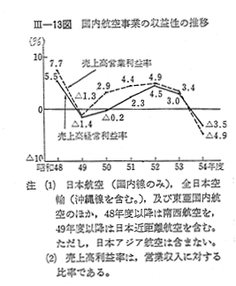 国内航空運送事業の最近7年間の利益率の推移は 〔III−13図〕のとおりであるが,54年度は,原油価格高騰のあおりをうけ燃料単価が急上昇したこと,及びジェット燃料税が倍額に引き上げられたこと等により,売上高営業利益率,売上高経常利益率はそれぞれ,5年ぶりにマイナス3.5%,マイナス4.9%に転じた。