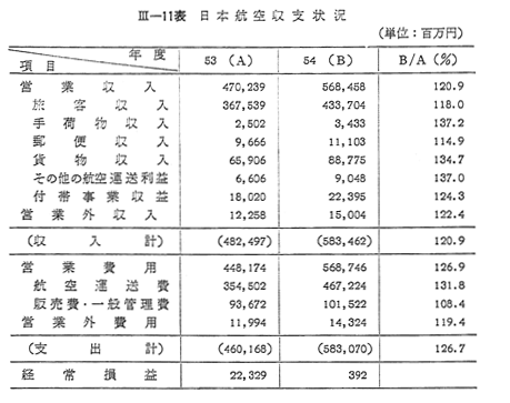 日本航空の54年度の収支は, 〔III−11表〕のとおりである。営業収入は前年度に比べて12.1%増の5,684億5,800万円で,総収入では20.9%増の5,834億6,200万円となったのに対し,総費用は5,830億7,000万円で,営業段階で2億8,800万円の欠損を計上したが,その原因としては急激な燃料費の高騰が考えられる。対前年費用増加額1,206億円のうち,燃油関連費用は792億円で66%を占めている。税引後利益は19億6,600万円となり,配当準備積立金6億円を取り崩すことによって,民間株式に対し8分配当を継続した。