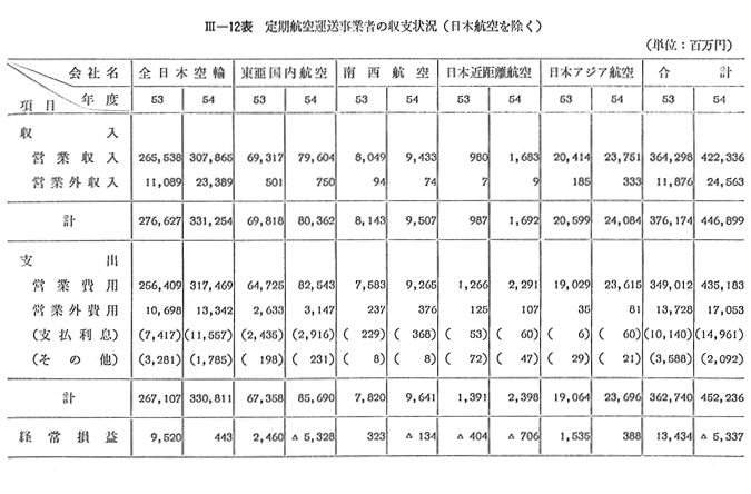 日本航空を除く定期航空運送事業者別の収支状況は, 〔III−12表〕のとおりである。