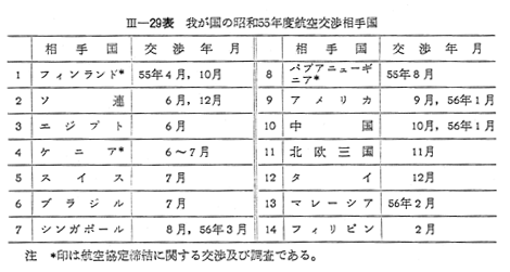 上記のほか,既に航空協定を締結している国との間でも航空協定の付表で定めている路線の改定,両国の指定航空企業の運航便数,使用機材の変更等について,必要に応じて航空当局間での交渉を行っている。また,運賃問題についても当局間で協議を行うケースが増えてきている。最近の傾向としては,太平洋線に対する各国の航空企業の新規参入又は増便の希望が増加しており,このための交渉が多くなってきているが,彼我の利益が一致せず,同一国と数次にわたる交渉を行う場合も出てきている 〔III−29表〕。
