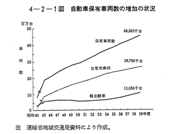 我が国の自家用乗用車台数は,昭和50年度末で,1,713万台であったが自動車の利便性,国民生活水準の向上等によりモータリゼーションが引き続き進展し,59年度末には,2,679万台となり,50年度に比し1,000万台近い増加を示している 〔4−2−1図〕。