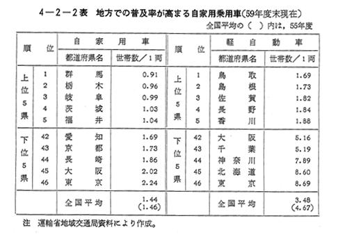 一方,その普及状況を都道府県別にみると,59年度末には,全国1位の群馬県が0.9世帯に1台,最下位の東京都が2.2世帯に1台となっており,地域による差は少なく,いずれの地域も高い普及状況を示している。また,近年,経済性,手軽さ等に優れた軽自動車の普及率が55年度において,4.67世帯/台であったが,59年度においては3.48世帯/台と高まっていることが注目されている 〔4−2−2表〕。