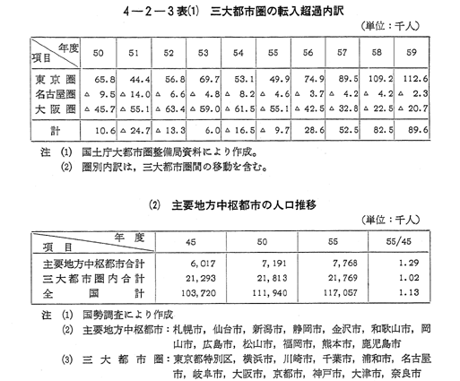 また,一方,30年代半ばからの我が国の高度経済成長に伴い,地方から大都市圏に大量の人口が流入集中し,過密・過疎現象を発生させることとなった。三大都市圏への人口の流入は,過密による各種弊害の顕在化,全国的な定住意識の高まり等により,40年代後半から減少し,50年代には,東京圏では依然流入超過が続いているものの大阪圏,名古屋圏では流出超過が続いており総体としては低い水準で移行している 〔4−2−3表〕(1)。他方,地方においては,地方定住促進のための各種施策により,人口の地方定着が進展してきており,特に地方中枢・中核都市やそれらの周辺部における人口の増加率が高くなっている 〔4−2−3表〕(2)。