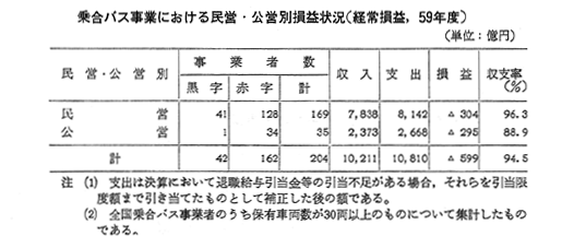 乗合バス事業における民営・公営別損益状況(経常損益,59年度)