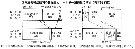 国内主要輸送機関の輸送量とエネルギー消費量の構成(昭和58年度)