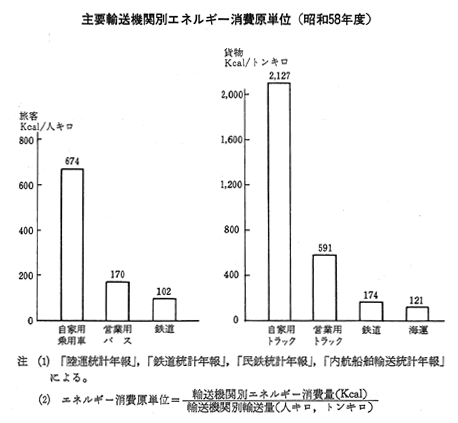 主要輸送機関別エネルギー消費原単位(昭和58年度)