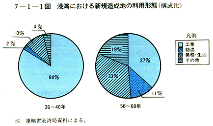港湾空間は港湾区域(海域)とその埋立地及び港湾活動と密接に関連する隣接周辺地域(陸域)とからなる空間である。この港湾空間の土地利用形態は時代の要請によって変化してきている。これを港湾において新規に造成される埋立地の土地利用比率でみると 〔7−1−1図〕,高度成長期には工業への利用が8割以上占め,業務・生活関連は1割程度にしかすぎなかったが,近年は,工業が4割程度で,業務・生活関連が3割に達している。総合的港湾空間の整備とは,こうした動きをとらえ,各種施策を講ずることにより,三つの空間の比率が適正に組み合わされることをめざしたものである。