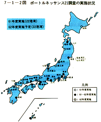 古くから整備が行われて,利用がなされてきた内港地区等においては,港湾施設の老朽化,陳腐化が顕在化しつつある。これら内港地区の再開発を進め,港湾の活性化を図って行くことが重要な課題となっている。このため,総合的港湾空間の創造を推進するための制度として「ポートルネッサンス21」を61年度に創設した 〔7−1−2図〕。「ポートルネッサンス21」は,港湾管理者が策定する基本計画に基づき各種事業制度を組み合わせ,官民一体となって総合的に事業を実施するものである。基本計画策定のための調査は,61年度22港で実施し,62年度も22港で実施中である。今後,これらの地域においては,調査結果に基づき多様な機能を導入することによって,物流地区,商業業務地区,レクリエーション地区あるいは市民に開かれた親水地区といった活力と潤いのある地区としての再開発が図られることとなる。