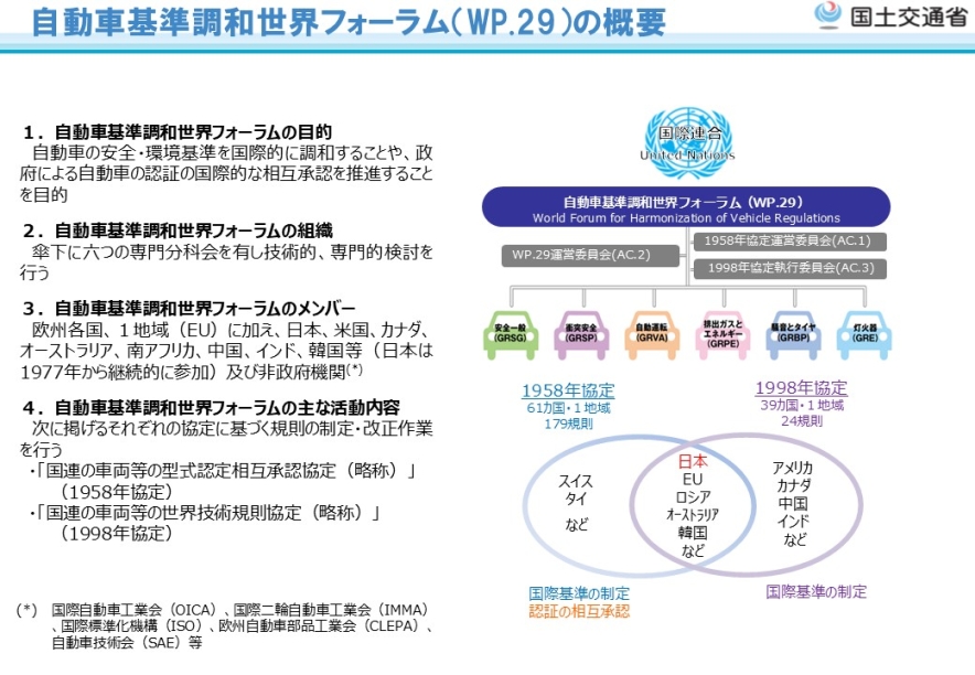 自動車基準調和世界フォーラム(WP.29)は、国連欧州経済委員会(UN/ECE)内に設置された、自動車安全・環境基準の国際調和と認証の相互承認を多国間で審議する唯一の場です。UN/ECEメンバー国のほか、1998年協定又は1958年協定の締約国等が参加可能であり、日本も積極的に参画しています。