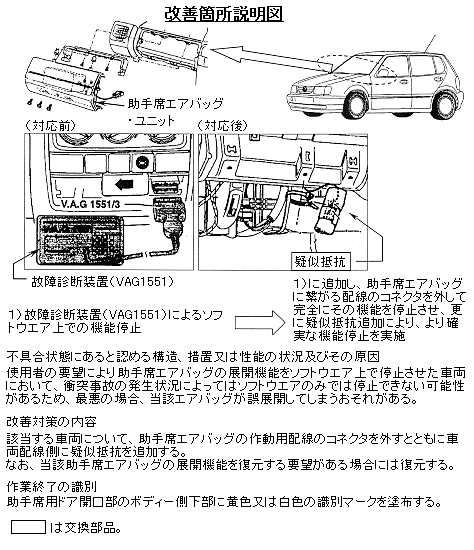 改善の内容 | 該当する車両について、助手席エアバッグの作動用配線のコネクタを外すとともに車両配線側に疑似抵抗を追加する。 なお、当該助手席エアバッグの展開機能を復元する要望があればプログラムを修復する。 | |