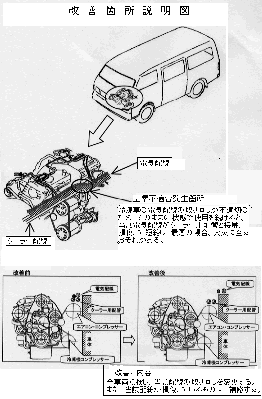 不具合の状況 | 冷凍車の電気配線の取り回しが不適切なため、そのままの状態で使用を続けると、当該電気配線がクーラー用配管と接触することから損傷して短絡し、最悪の場合、火災に至るおそれがある。 | |