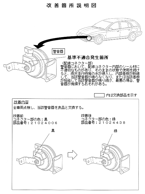不具合の状況 | 警音器において、配線コネクター内部のシール材に不適切なものがあり、そのままの状態で使用を続けると、雨天走行時等の水が浸入し、内部の基板が断線して、当該警音器が鳴らなくなり、または、当該基板が短絡して、当該警音器が鳴り続け、最悪の場合、警音器が焼損するおそれがある。 | ||