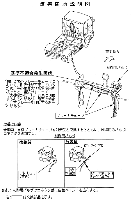 改善の内容 | 全車両、当該ブレーキチューブを対策品と交換するとともに、制御用のバルブにコネクタを追加する。 | |