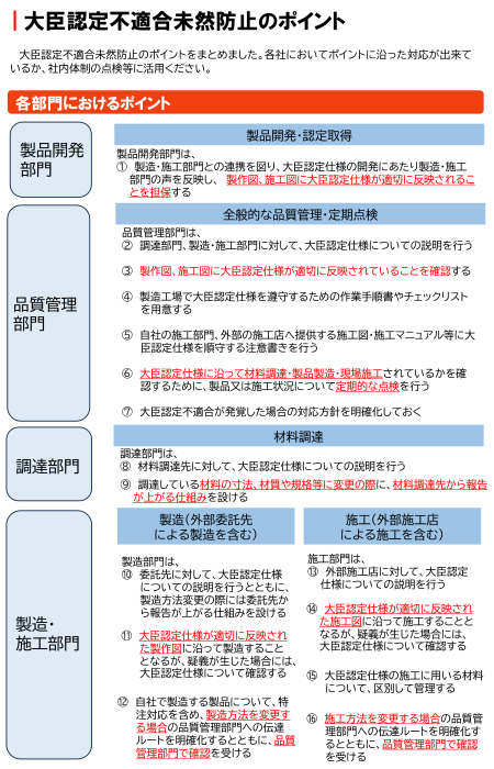 [1]大臣認定不適合を未然防止し、建築物の安全性を確保する等の観点から、社内体制点検のポイントをお知らせするとともに、必要に応じて注意喚起をおこなっています。