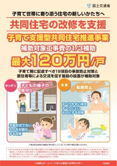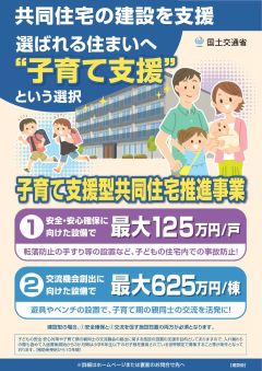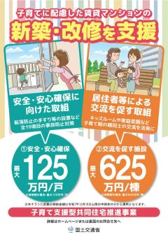 国土交通省では、共同住宅(賃貸住宅及び分譲マンション)を対象に、事故防止や防犯対策などの子どもの安全・安心に資する住宅の新築・改修の取り組みや、