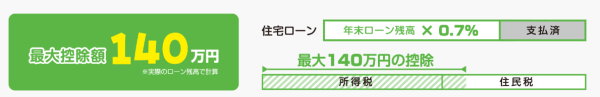 上記のようなリフォーム・増改築を行った場合には、最大10年間、各年末の住宅ローン残高の0.7%を所得税額から控除する制度です。(所得税額から控除しきれない場合、翌年の住民税からも一部控除します。最大9.75万円/年)