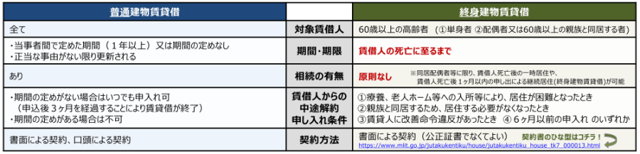 終身建物賃貸借制度は、「高齢者の居住の安定確保に関する法律」に基づき、都道府県知事等の認可を受けた事業者が、借家人が生きている限り存続し、死亡時に終了する(賃借権が相続されない)1代限りの賃貸借契約を結ぶことができる制度です。