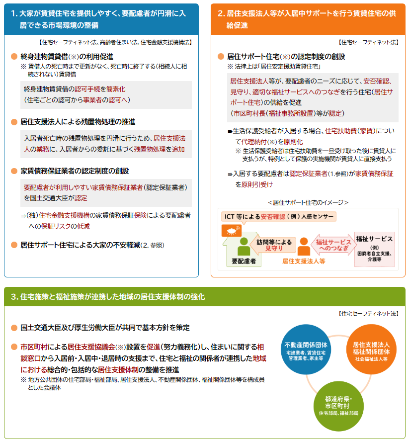 改正法では、以下の3点を柱として、要配慮者が安心して生活を送るための基盤となる住まいを確保できるよう、賃貸住宅に円滑に入居できるための環境の整備を推進することとしています。