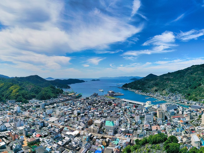 八幡浜港は、愛媛県の西部に位置し、四国と九州をつなぐ西の玄関口です。波が穏やかな天然の良港として知られる港湾。港周辺には地域の素材を活かした産直・物販・飲食施設があり、背後には四国八十八景に選定された『向灘の段々畑』を間近に見ることができます。 農業や水産業といった一次産業に特化しており、特に段々畑を利用した柑橘類は愛媛県の農業と八幡浜市の発展に大きく貢献しています。