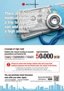 観光庁では、民間医療保険の加入勧奨のためのチラシ・動画を作成しておりますので、訪日外国人旅行者へのツアー販売等にあたり、ご活用ください。