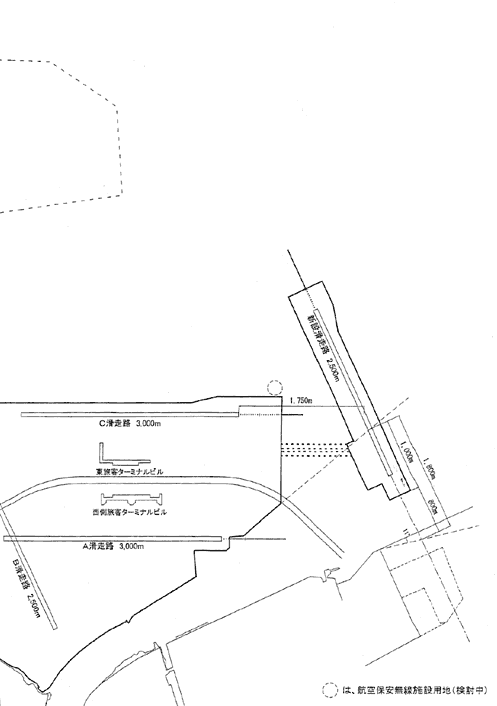 新滑走路については、多摩川の河川管理上支障を生じさせないよう措置するものとする。このため、多摩川河口域(別図参漂)については以下の条件とする。 河川の諸元については、 ・計画高水量 7,000m3/S ・計画堤防高 A.P +6.500m ・計画高潮位 A.P +3.800m ・河床高 A.P -3.706m 多摩川河口域に係る部分については、河川管理施設等構造令の「橋」に準拠するものとする。 ・基準径間長 50m以上 ・最小径間長 25m以上 ・河積阻害率 8%以内 |