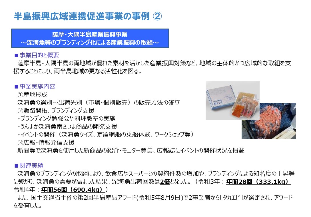 島原・天草地域連携促進事業 薩摩・大隅半島産業振興事業 ~深海魚等のブランディング化による産業振興の取組~ 紀伊半島移住プロモーション事業