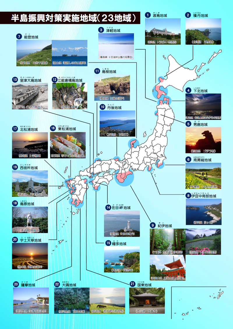 現在、全国では半島振興法に基づき、23の地域を半島振興対策実施地域として指定しています。