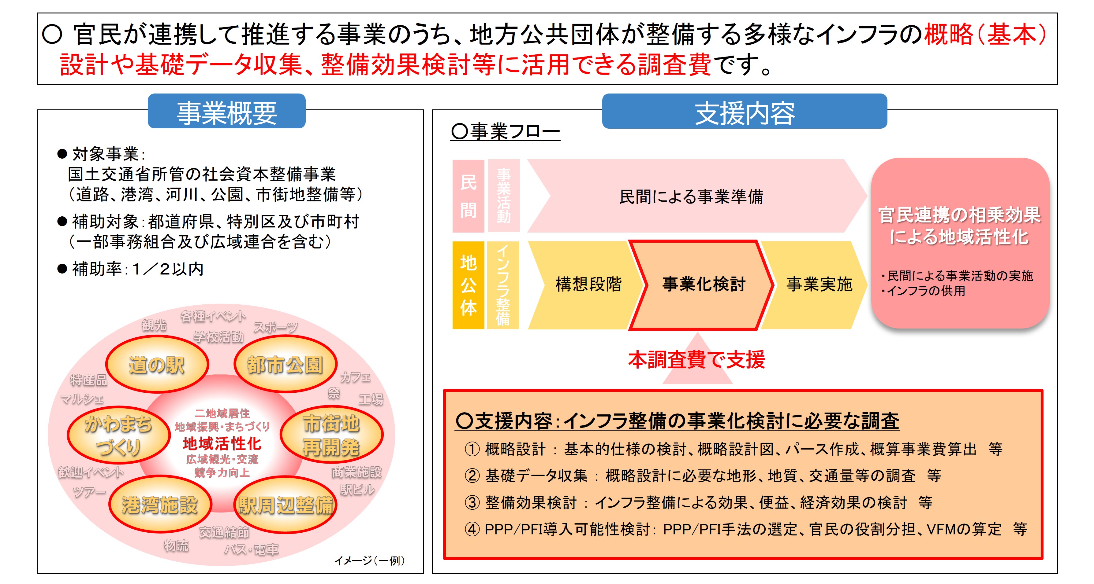 国土交通省所管(道路、港湾、河川、公園、市街地整備等)の社会資本整備事業の事業化を検討するための調査を実施できます。