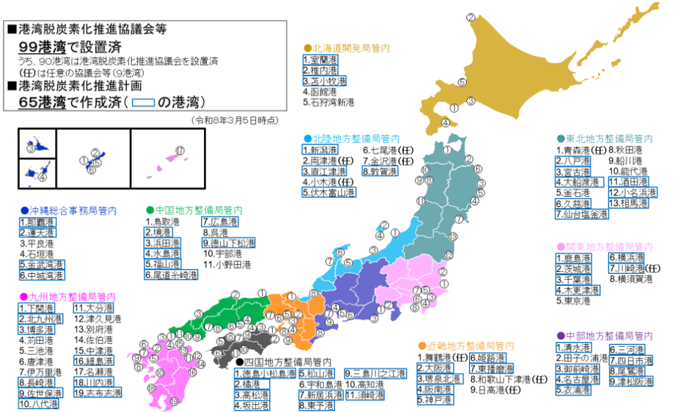 このため、令和4年の港湾法改正により、港湾管理者が、官民の関係者が参加する「港湾脱炭素化推進協議会」を開催し、同協議会における検討を踏まえ、「港湾脱炭素化推進計画」を作成し、各関係者が同計画に基づいてそれぞれの取組を進める体制を構築しました。