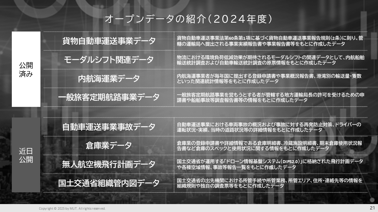 Project LINKSは、国土交通分野の行政情報(道路・河川、公共交通、貨物運送、海運、旅客船、ドローン、空き家、倉庫など)を活用しやすいデータとして整備し、オープンデータ化することで、データに基づく政策立案の推進(EBPM:Evidence-Based Policy Making)や新たなビジネス創出の実現を目指すもの。2024年度のユースケース開発を踏まえ、貨物自動車運送事業データ、モーダルシフト関連データ、内航海運業データ、一般旅客定期航路事業データが既にオープンデータとして公開されました。これらに加えて、自動車運送事業事故データ(2025年9月11日に公開)、倉庫業データ(2025年9月9日に公開)、無人航空機飛行計画データ(2025年10月2日に公開)、国土交通省組織管内図データが近日公開される予定です。