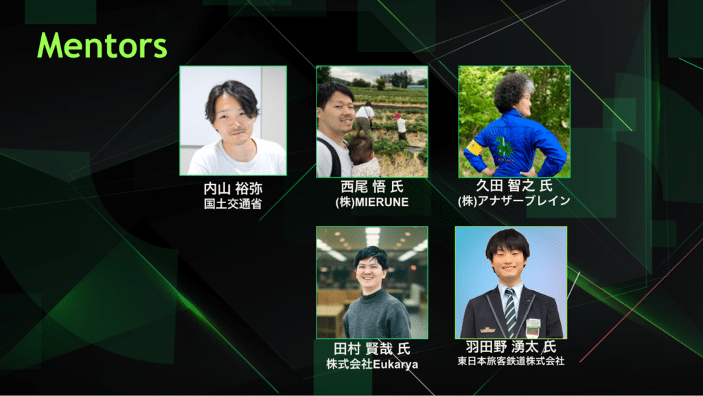 当日は、以下5名がメンター/審査員として、各チームへアドバイスを行った。