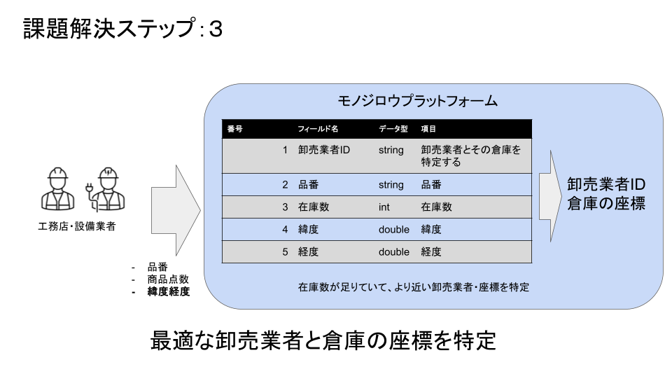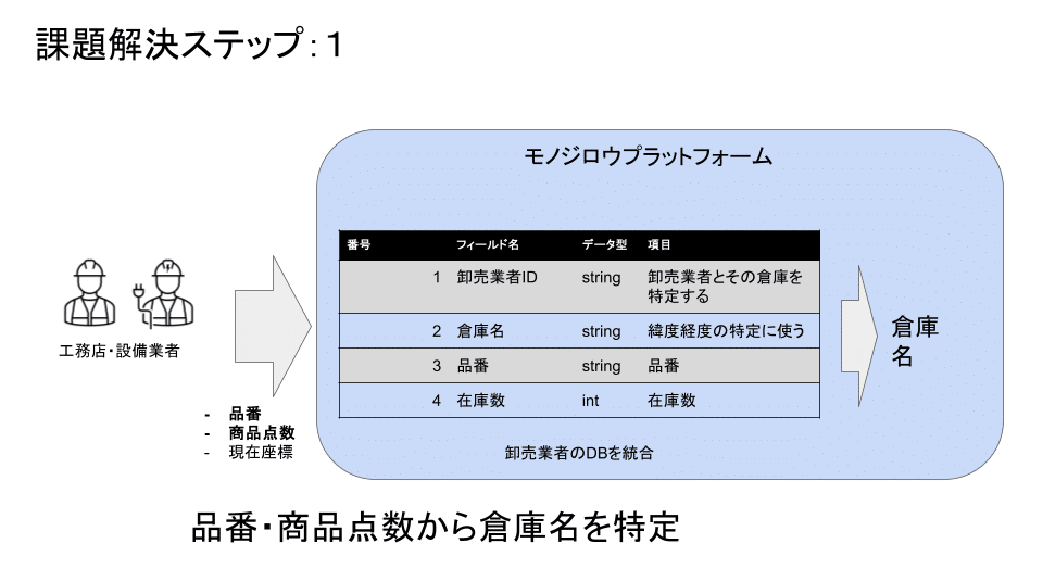 給湯器、エアコン、配管などの住宅設備は、製造元のメーカーから卸売業者を介して、購入元の工務店や住宅設備の施工事業者へ配送される。工務店や施工事業者は必要なものをすぐに入手したいので、近くの倉庫から配送してほしいが、どの卸売業者の倉庫が近いか、倉庫に在庫があるかどうか、という情報は知るすべがない。