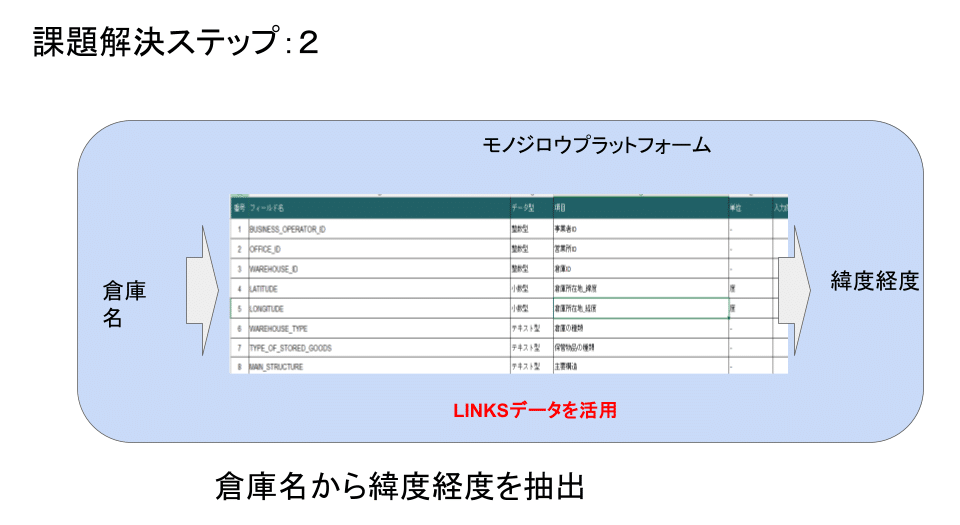 そこで、同チームは、卸売業者が各社の在庫を共有するプラットフォーム「モノジロウ」のアイデアを発想した。モノジロウで発注すると、一番近い卸売業者倉庫から品物が発送されるというものだ。LINKSの倉庫データのうち、倉庫の位置情報を活用する。品物が最短で届くメリットに加え、物流コストやCO2排出量の削減にもつながるとした。