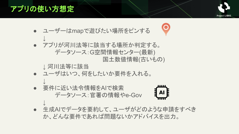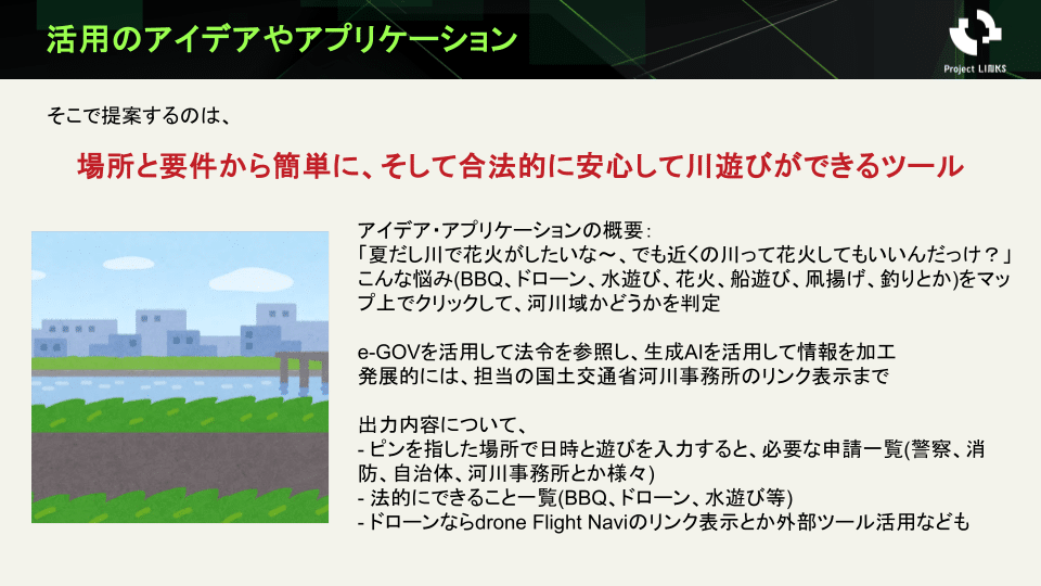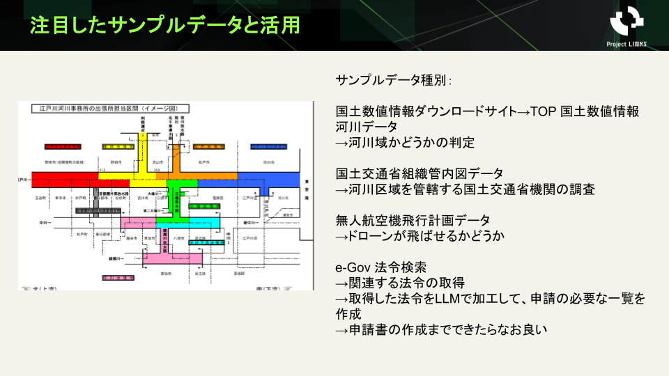 LINKSの管内図データにおける河川に関するデータやドローンのデータに加えて、法令検索データポータルe-Govのデータなども活用する。さらに、生成AIを組み合わせることで、法令の解釈や行政機関への申請についてのアドバイスを得られるようにしたいと構想を説明した。