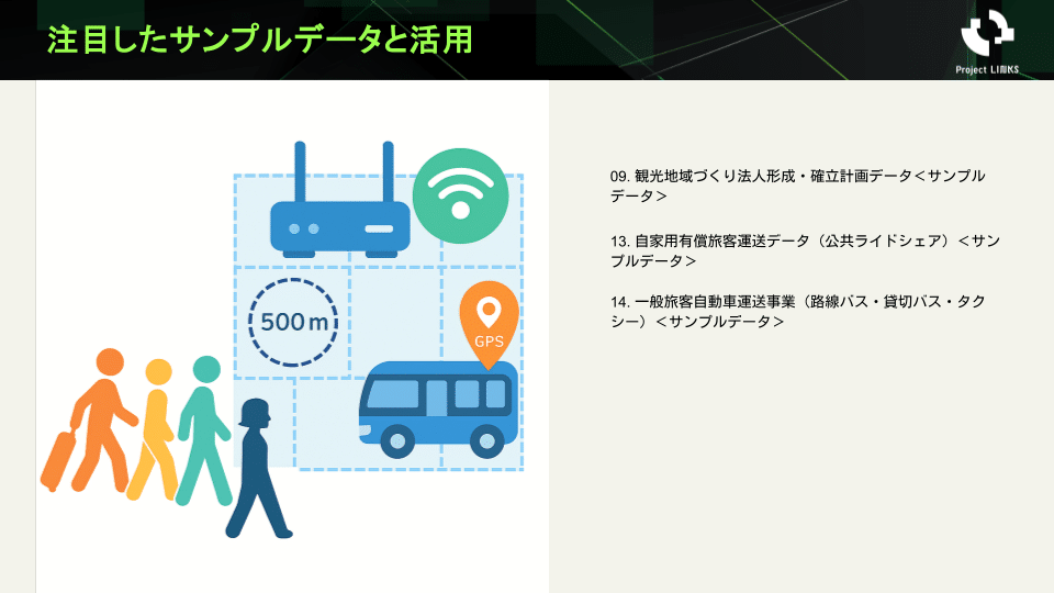 チーム・地域の魅力みつけ隊は、地域観光を活性化するためのデータ活用として、LINKSの観光地域づくり法人(DMO)形成・確立計画データ、自家用有償旅客運送データ(公共ライドシェア)、一般旅客自動車運送事業(路線バス・貸切バス、タクシー)データの3つに注目した。